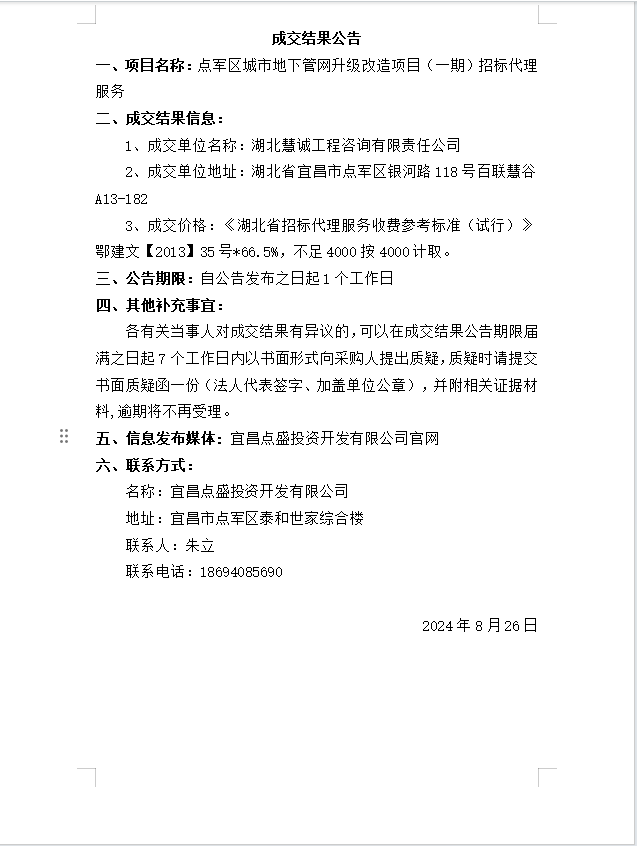 點軍區(qū)城市地下管網(wǎng)升級改造項目(一期)招標(biāo)代理服務(wù)成交公告