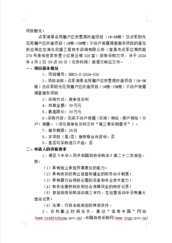 點(diǎn)軍湖景名苑棚戶區(qū)安置房改造項(xiàng)目(1#-8#樓)及點(diǎn)軍陽(yáng)光花苑棚戶區(qū)改造項(xiàng)目(1#樓-15#樓)不動(dòng)產(chǎn)地籍調(diào)查服務(wù)項(xiàng)目談判公告